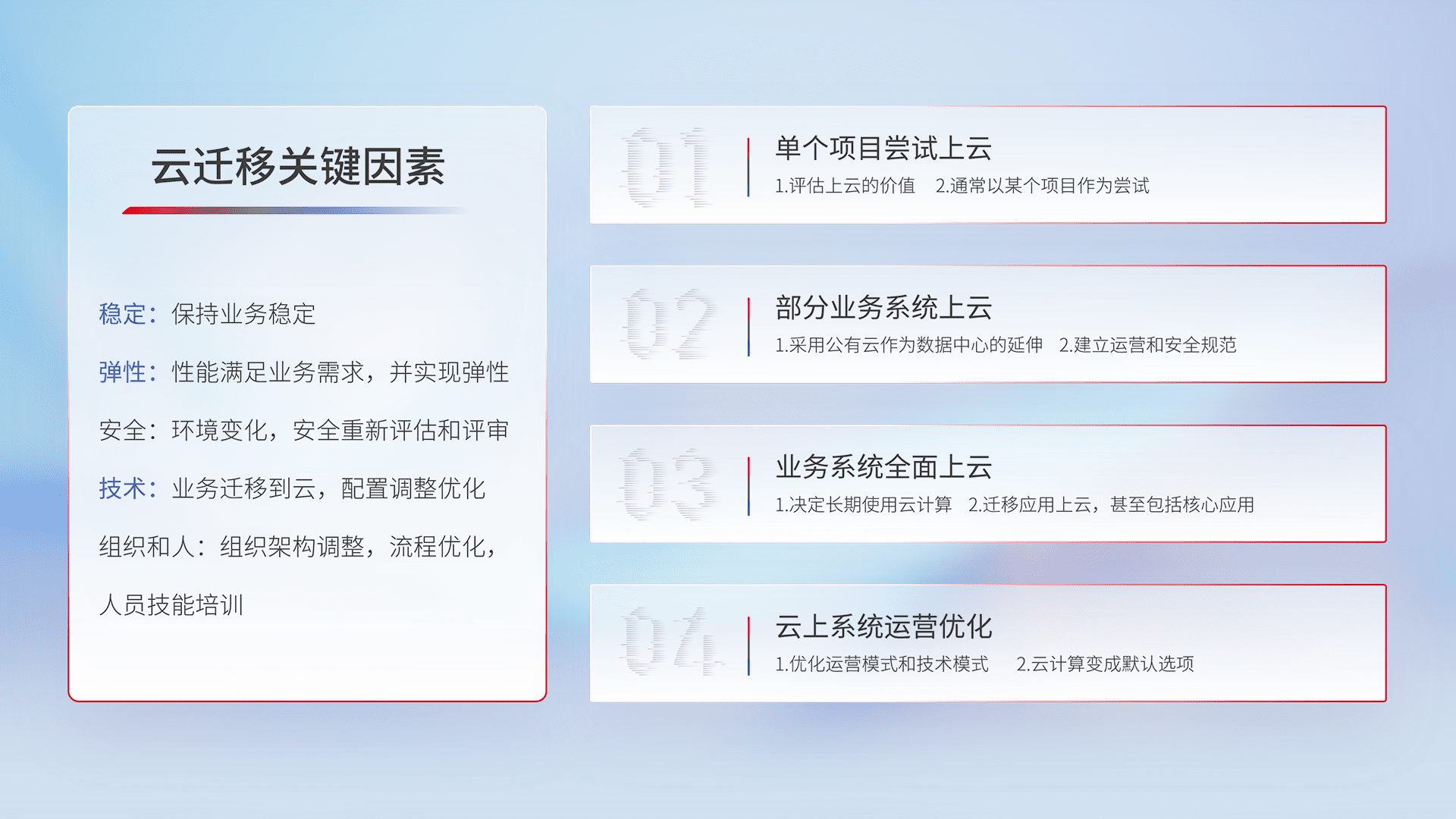 结合实际业务,,,,从规划设计、、、云平台选型、、云原生改造、、数据迁移、、、集成交付,,迁移全过程为客户识别最佳上云路径,,做好风险识别管理,,,设计网络架构、、、身份权限、、安全审计合规、、操作审计、、日志审计、、监控告警策略、、、、多站点容灾设计等,,,,对云上基础设施进行整体规划,,,提升IT治理水平,,,以满足弹性、、、高可用、、、、高性能的需求。。。。