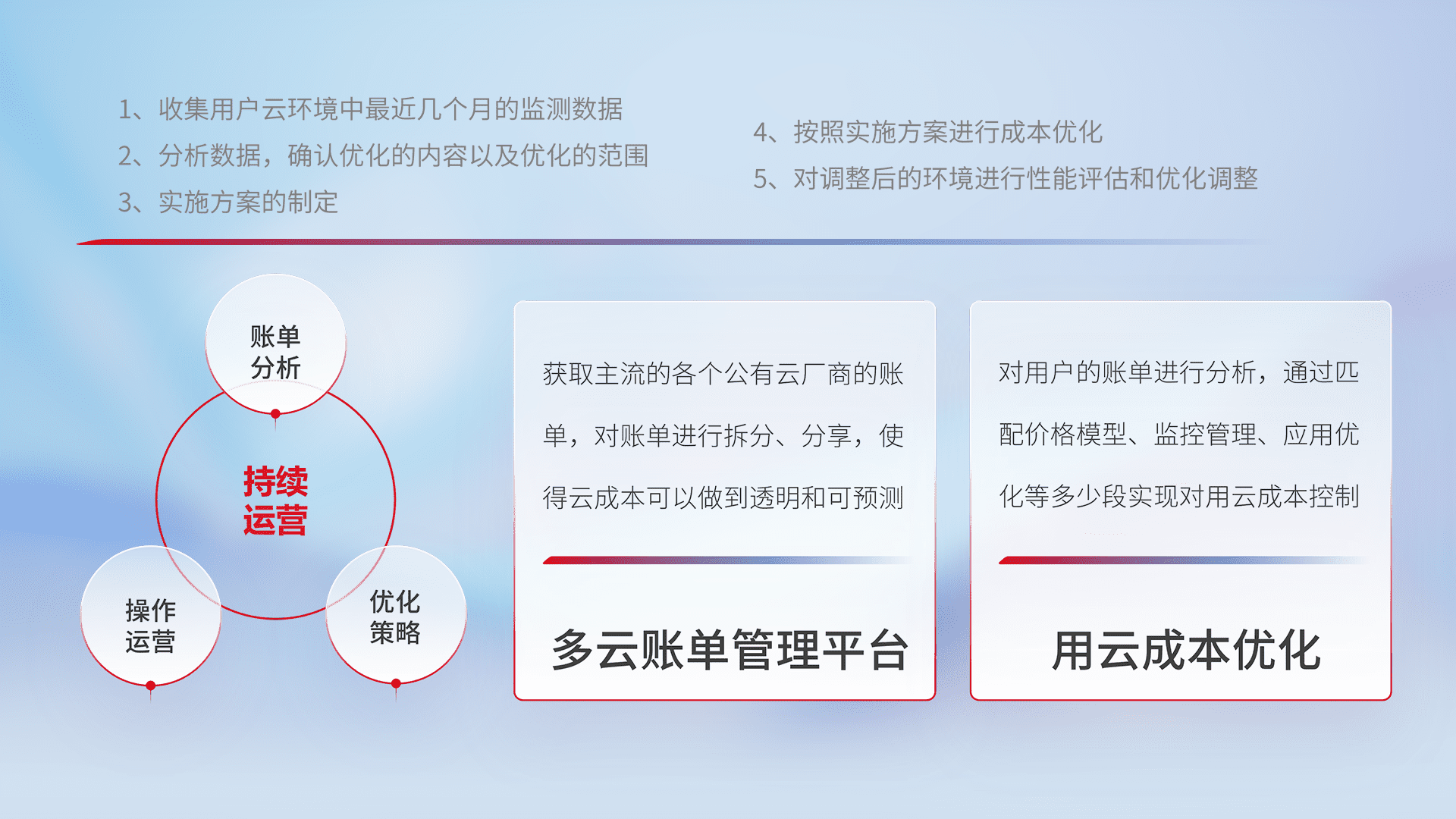 通过多云纳管,,,,以统一的资源数据模型把客户的云资源进行抽象和封装,,进而实现对多云资源的统一操作,,保障云资源管理的可靠性、、、稳定性与可用性。。。。量身定制化运维内容,,,配置、、、、开发运维、、、、补丁管理、、备份、、监控、、认证和访问管理、、、审计和日常巡检等,,,,保障在用云过程中的可靠度,,,稳定度以及高可用率。。。。